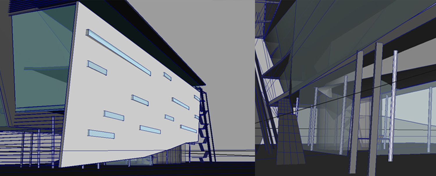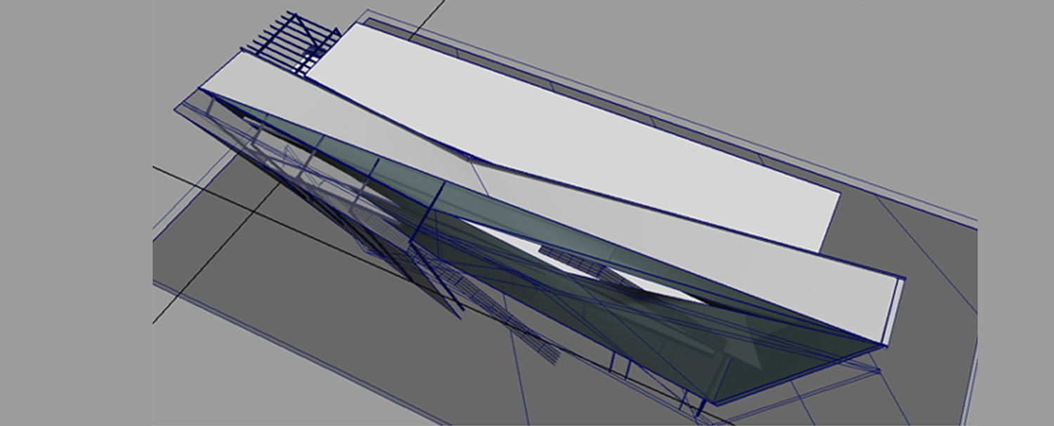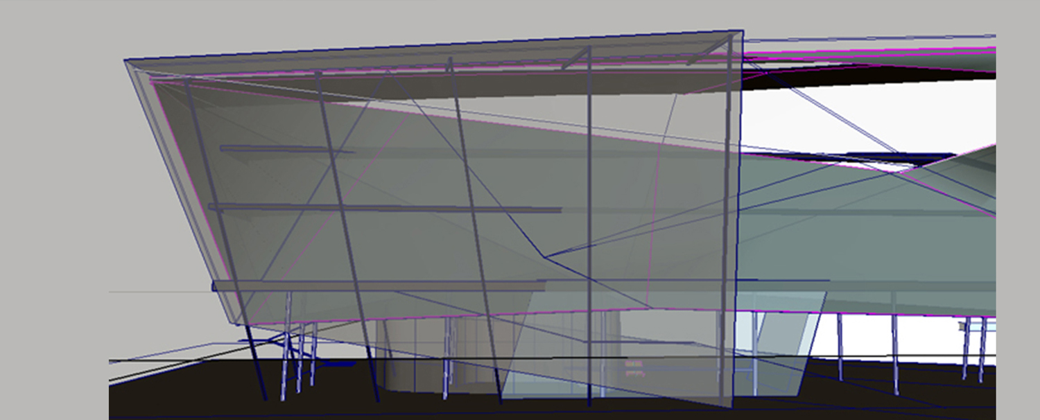 A three layered skin offers organization of functions. the first layer is a steel mesh (which semi-shades public areas), the next layer is glass (behind which are the gallery, meeting and conference rooms) the next layer is part void and part dry wall behind which is studio space for architects.
