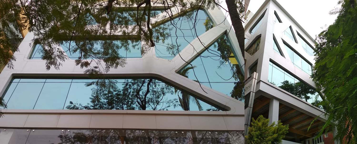 This commercial building is on a prominent main avenue of Indiranagar, Bangalore. The fragmented façade is an experimentation in creating abstract fragments which are large based on the views looking out and small based on the privacy of the function inside. The building features high-street retail on the first two floors, office spaces on the next three levels. It has one underground car park.