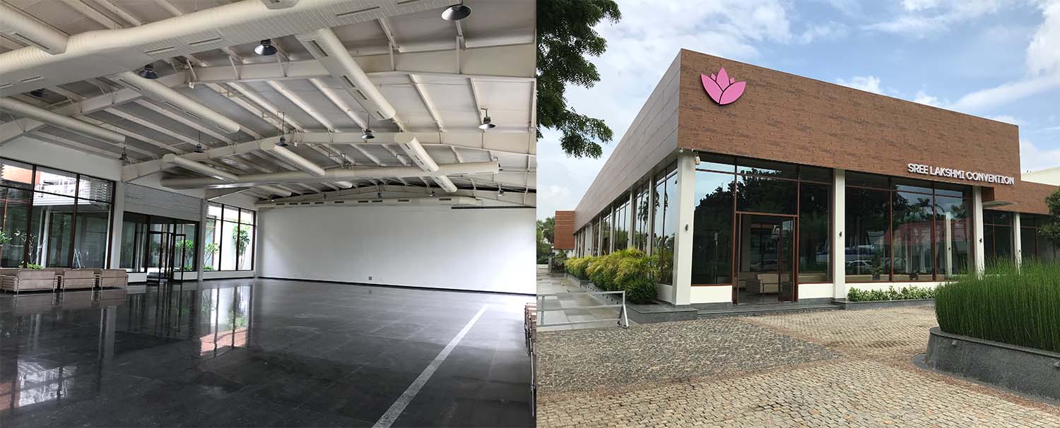 Sree Laxmi Convention Centre is located in Hyderabad and is designed for weddings, exhibitions, and other family functions. It is designed on a 2 acre land with the main hall of 25000 sft which can accommodate 800 guests. The adjoining dining hall can accommodate 500 guests. The hall is made out of prefabricated steel trusses to achieve the large column free span.